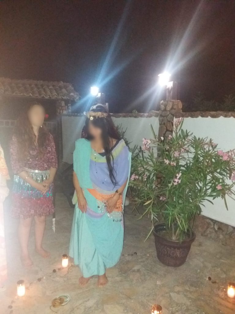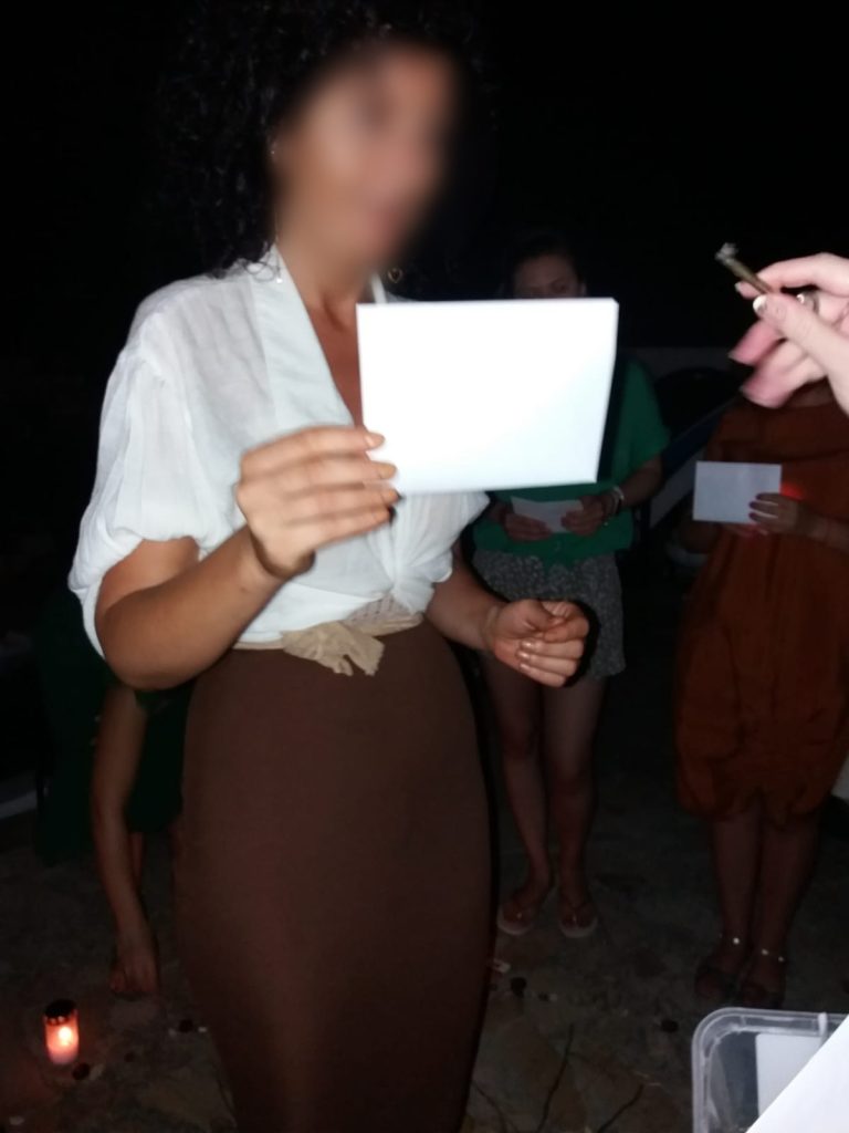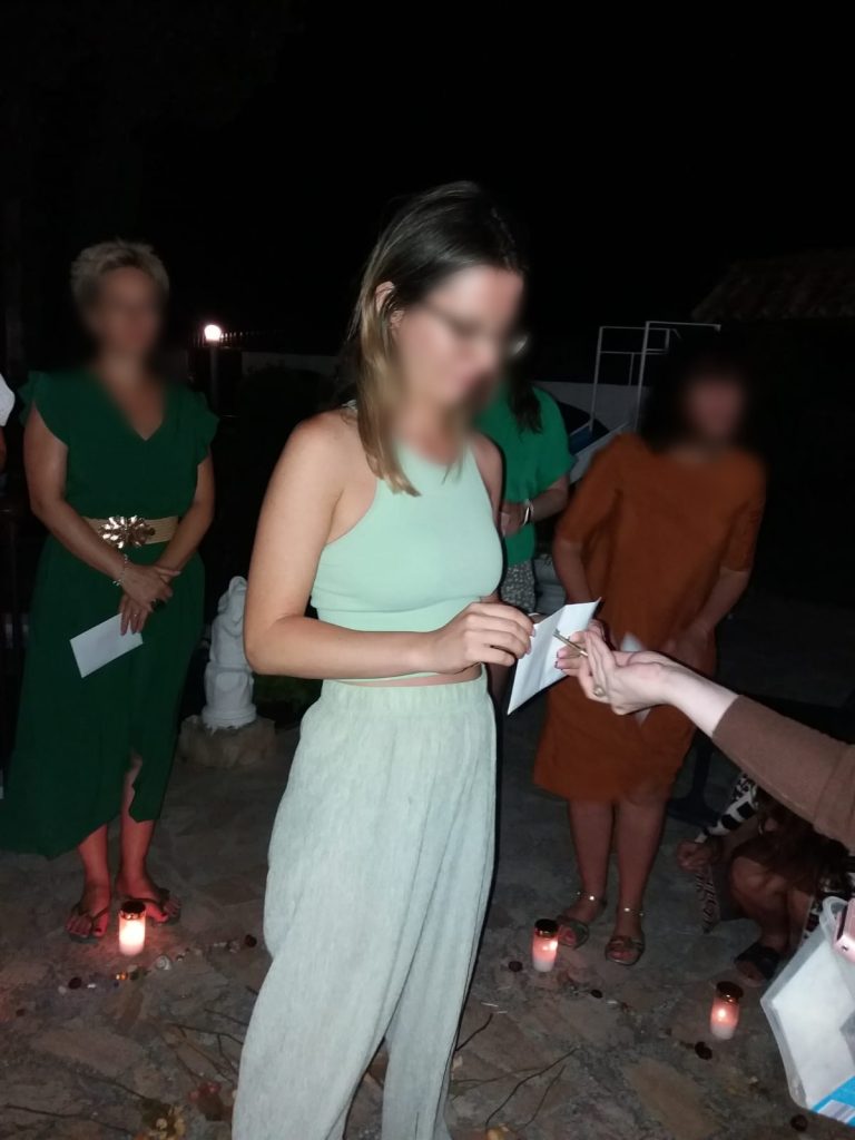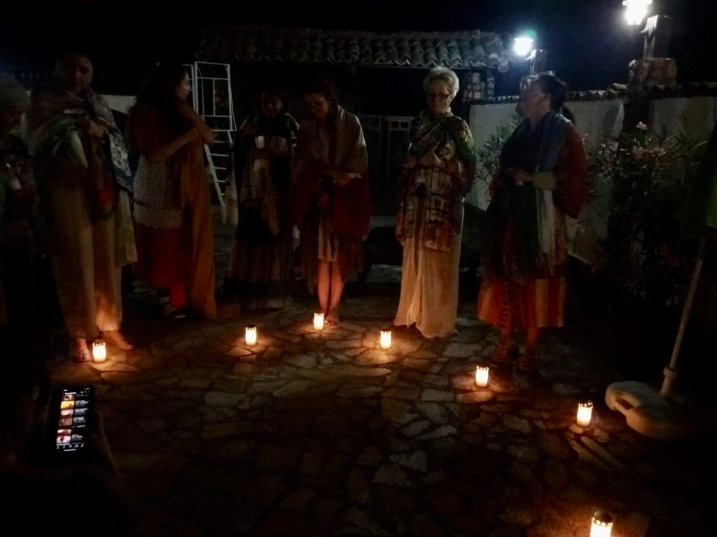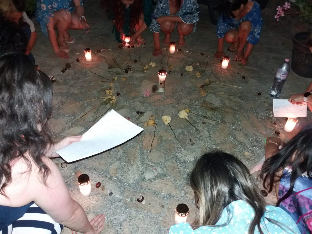 Am început tabăra cu o ceremonie sub mantia nopții, cu lumânări și eșarfe fluturânde spre cer. Am deschis energetic retreat-ul, am chemat ajutoarele de lumină, ne-am deschis ușa vindecării și am pășit in universul atemporal al feminității. Am făcut cunoștință una cu cealaltă, am setat obiective si am pus intențiile colective sub forma unui Pranam (un dans a cărui mișcări simbolizează toate câte o intenție de vindecare).