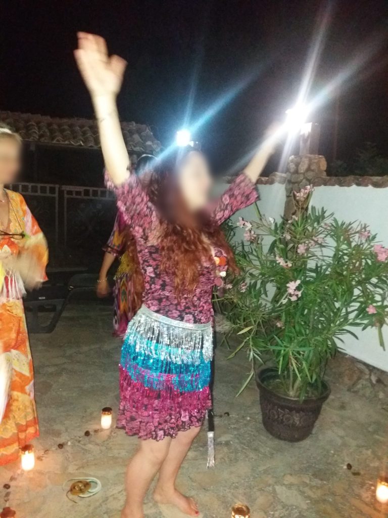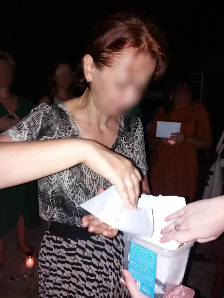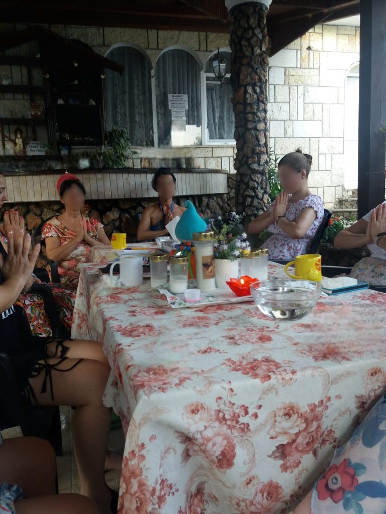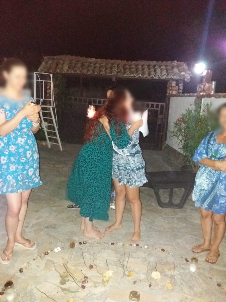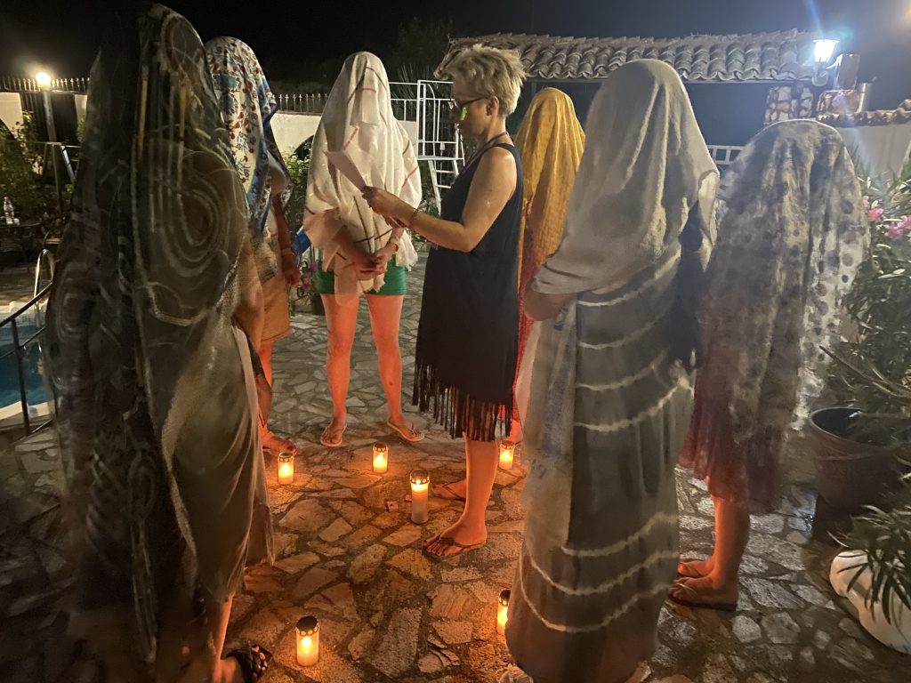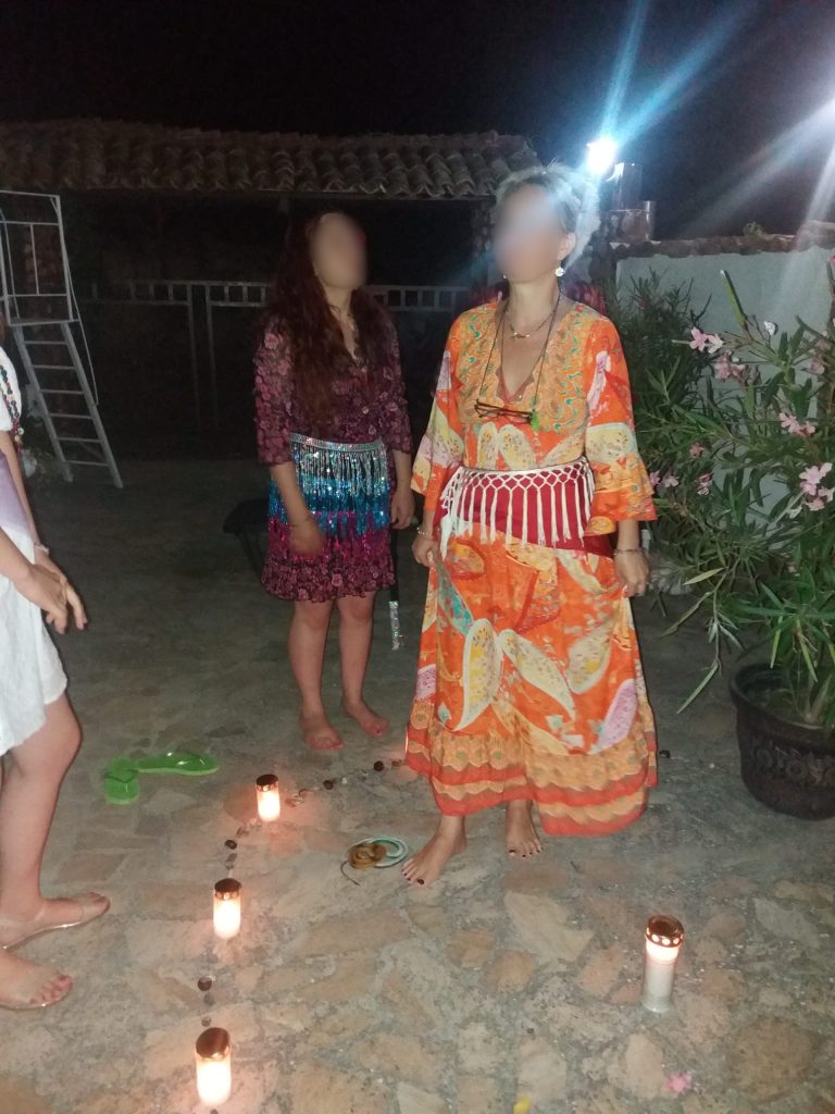Am început tabăra cu o ceremonie sub mantia nopții, cu lumânări și eșarfe fluturânde spre cer. Am deschis energetic retreat-ul, am chemat ajutoarele de lumină, ne-am deschis ușa vindecării și am pășit in universul atemporal al feminității. Am făcut cunoștință una cu cealaltă, am setat obiective si am pus intențiile colective sub forma unui Pranam (un dans a cărui mișcări simbolizează toate câte o intenție de vindecare).