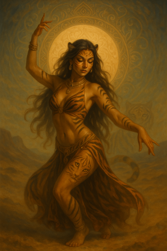 Tigresa este activată prin corp – nu prin analiză. De aceea, în dansul sacru, se lucrează mult cu zonele în care ea se manifestă natural: bazinul, picioarele, abdomenul, umerii. Printr-o postură clară, prin mișcări ferme, printr-o respirație profundă care coboară în pântec. Este dansul care nu caută să fie frumos, ci adevărat. Care nu seduce, ci transmite: „Sunt aici. Mă văd. Mă respect. Și aștept același lucru de la tine.”